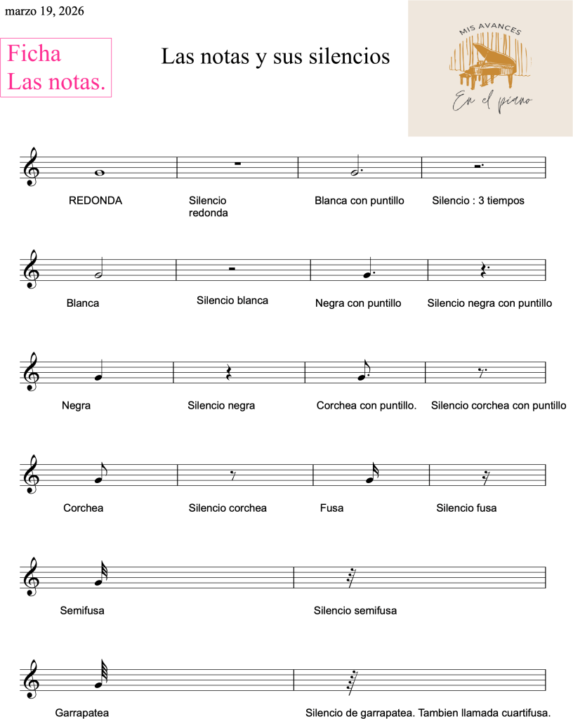 Las notas musicales: Redonda , la qué más dura . Blanca, Negra, Corchea y semicorchea. Al comienzo del piano son las que más se usas, Luego están la fusa y la semifusa.